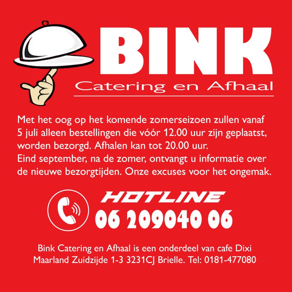 Geen tijd om uit lunchen te gaan? Of een smakelijke lunch nodig tijdens een vergadering? Bink Catering & Afhaal is de nieuwe culinaire service van Cafe Biljart Terras Dixi Brielle.